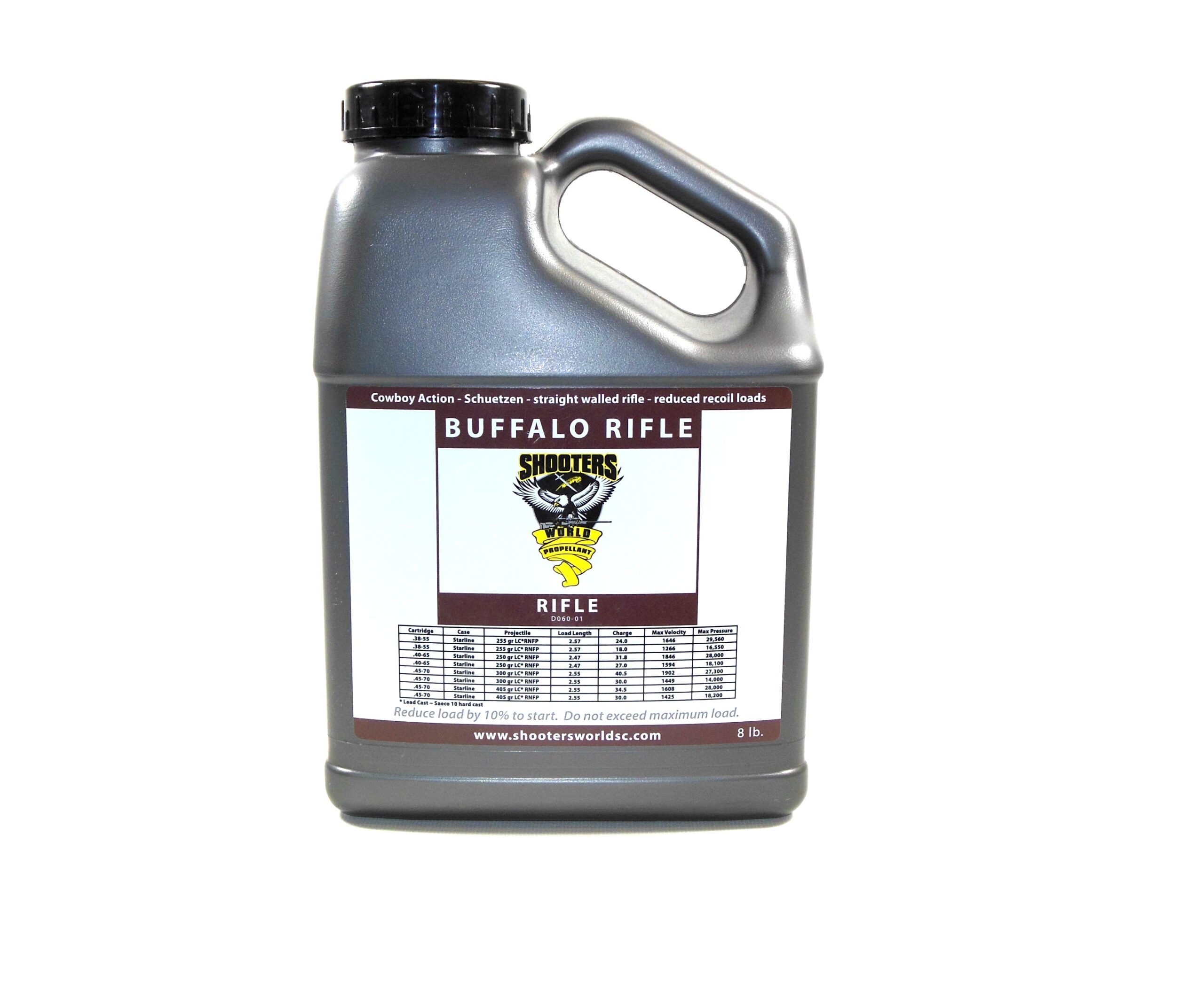 Always follow manufacturer guidelines and safe reloading practices when using Shooters World Buffalo Rifle Smokeless Powder. Ensure compatibility with your specific caliber and equipment before use. Store in a cool, dry location and handle responsibly according to industry safety standards.